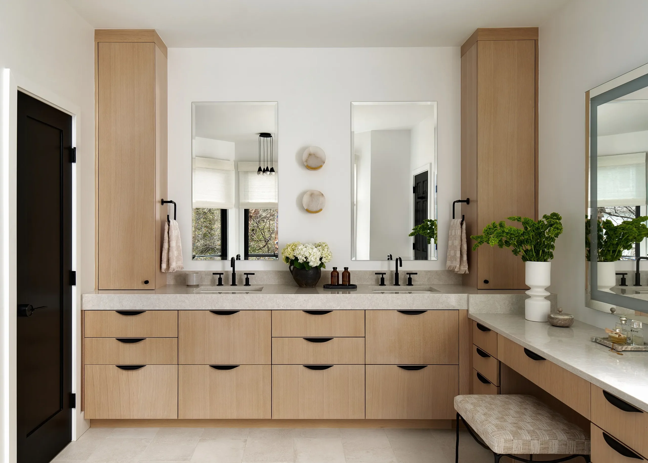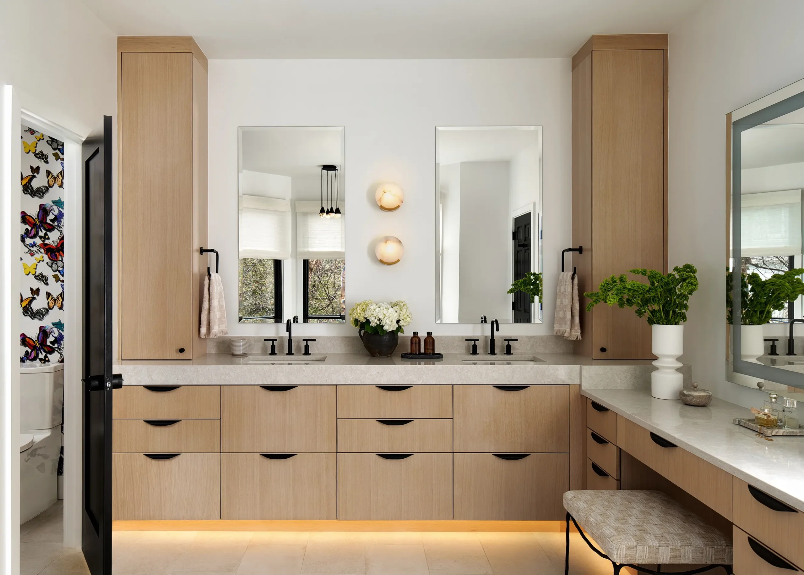 We took a primary bathroom circa the 1990s and brought it up to date. We ripped out cabinets that were too short, a poorly used closet and a built-in tub. We have all of the amenities here for a luxe retreat – heated floors, undercabinet lighting, soaking tub, make-up vanity and plenty of storage.